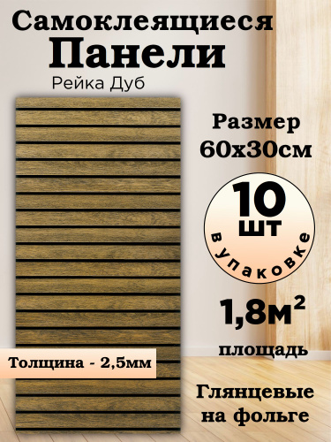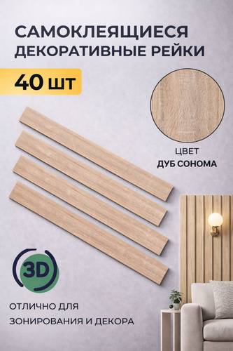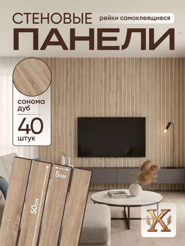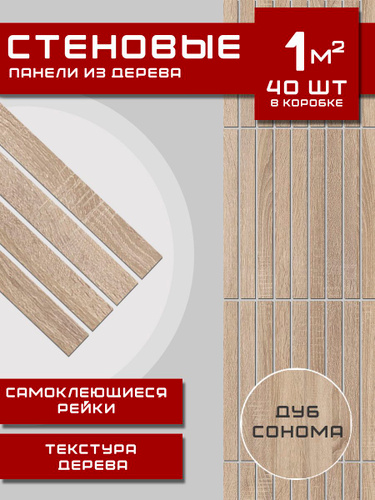 Стеновые панели реечные, декоративные рейки на стену, рейки самоклеящиеся Дуб сонома 500х50 мм, 40 шт, 1 кв.м