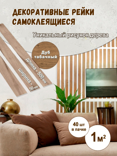Стеновые панели реечные, декоративные рейки на стену, рейки самоклеящиеся Табачный дуб 500х50 мм, 40 шт, 1 кв.м