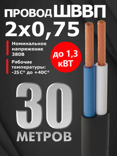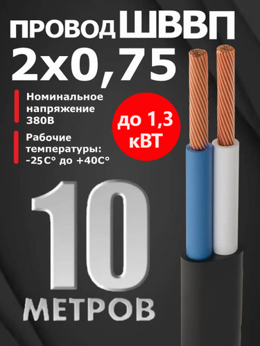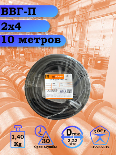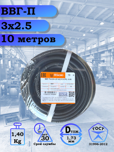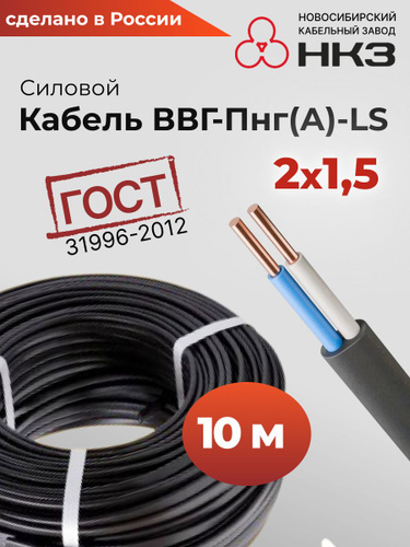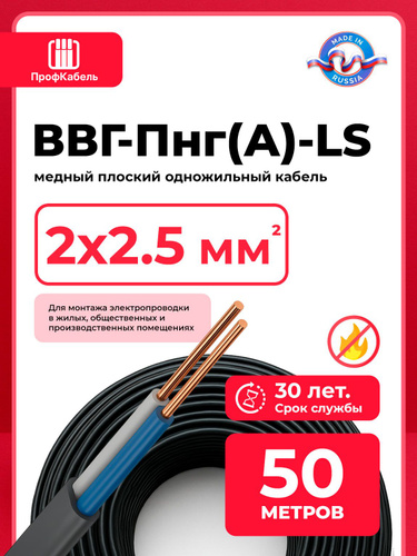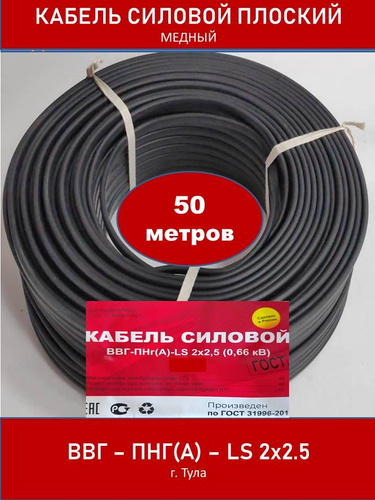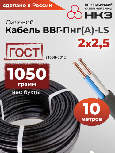 Силовой кабель ВВГ- Пнг(А)-LS 2x2.5 мм ГОСТ, медный, плоский, бухта 10 м, 1050 гр., для проводки в доме и квартире, Россия
