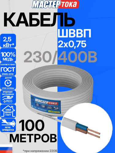 Провод электрический ШВВП 2х0,75 медный 100 метров Мастер Тока