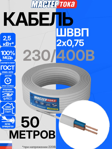 Провод электрический ШВВП 2х0,75 медный 50 метров Мастер Тока