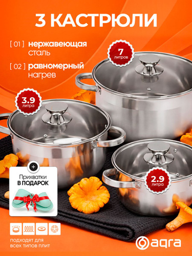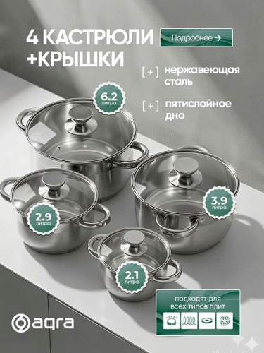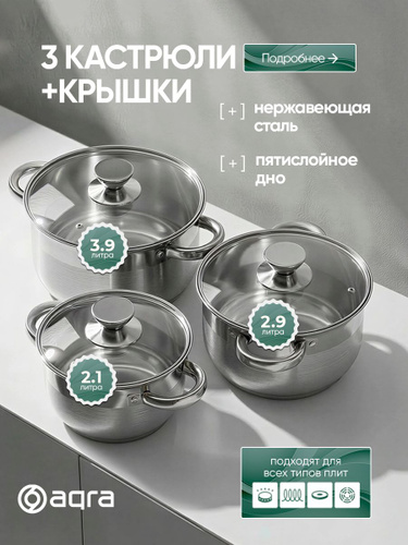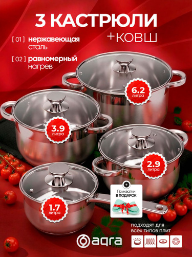 Набор кастрюль с крышкой, из нержавеющей стали, AQRA, с толстым дном, для всех видов плит