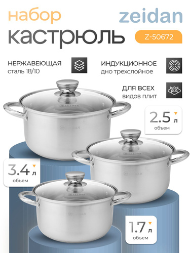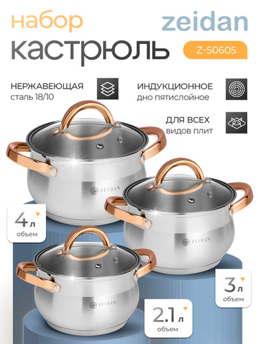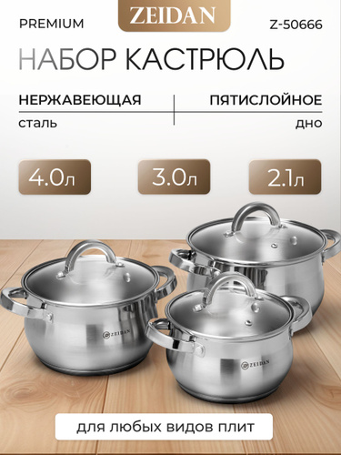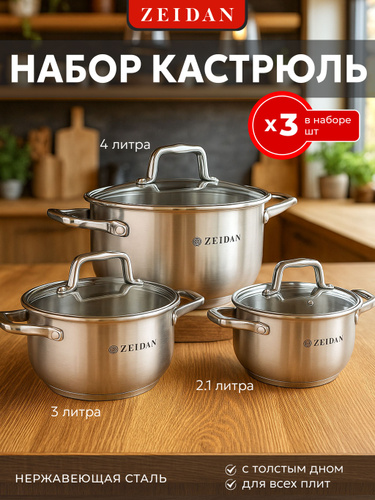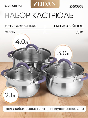 Набор кастрюль из нержавеющей стали 2.1л, 3 л, 4л с крышками Zeidan для индукционной и газовой плиты