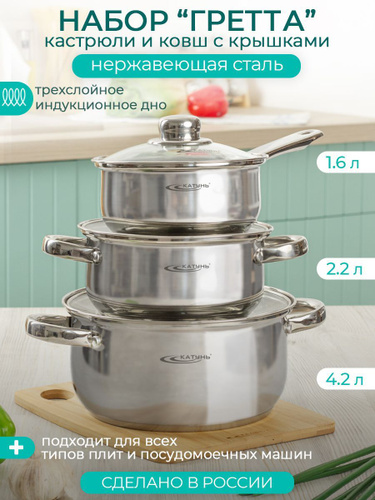 Кастрюля, Нержавеющая сталь, 2,8 л, 3,4 л, 4,1 л, 3 шт