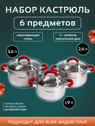 Набор кастрюль из нержавеющей стали с крышкой 1.9 л, 2.6 л и 3.6 л KELLI, 6 предметов, подходит для всех видов плит, включая индукционных, многослойное капсульное дно