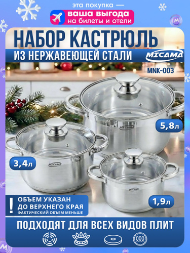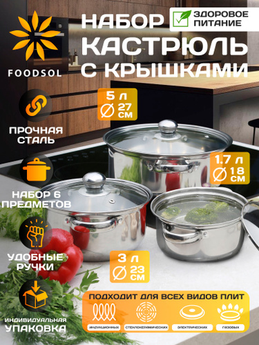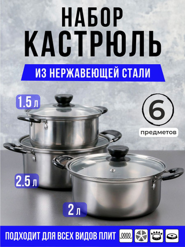 Набор кастрюль из нержавеющей стали 6 предметов, 3.6 л 2.7 л 1.9 л, посуда для всех типов плит, с крышками