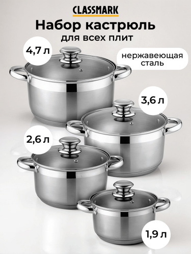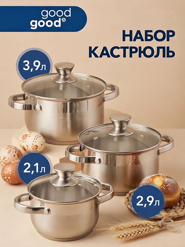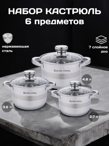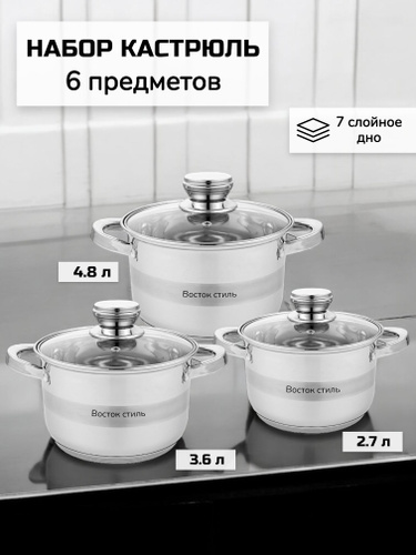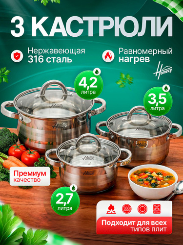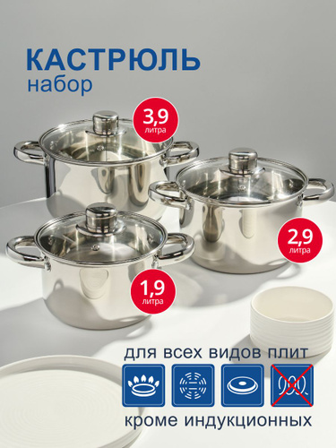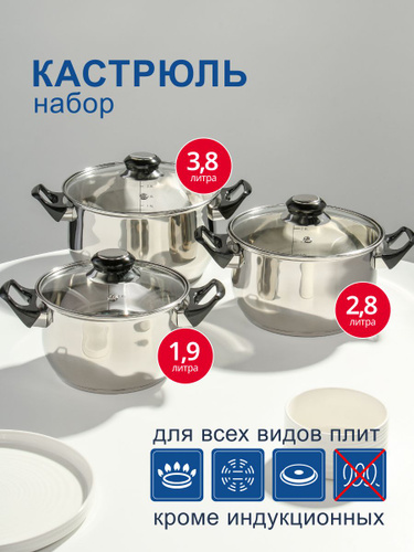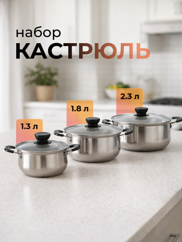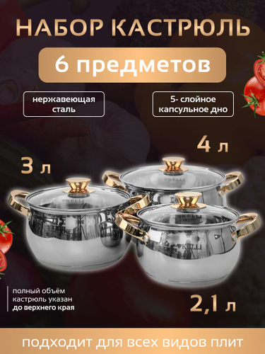 Набор кастрюль из нержавеющей стали 6 предметов с стеклянными крышками, индукция, объемы 1,3 л, 1,8 л, 2,3 л