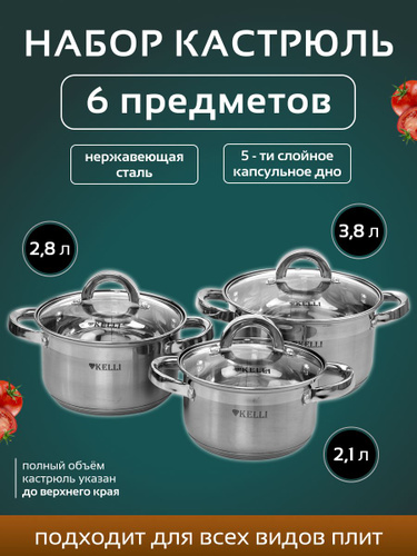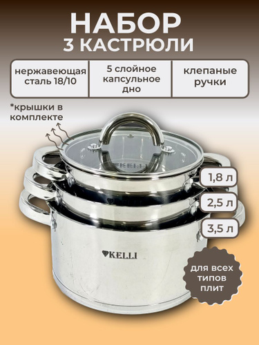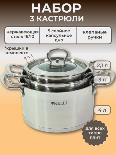 Набор кастрюль KELLI из нержавеющей стали с крышкой, 6 предметов, 2.1л, 3л, 4л, подходит для всех плит включая индукционные плиты, многослойное капсульное дно