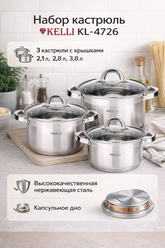 Набор кастрюль из нержавеющей стали с крышками Kelli (Келли) KL-4701 1,8, 2,5 и 3,5 л