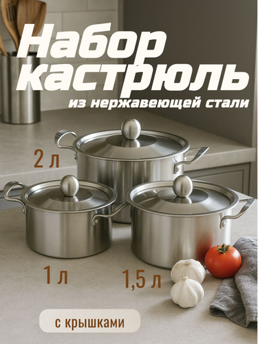 Набор кастрюль с крышками из нержавеющей стали, 3 штуки
