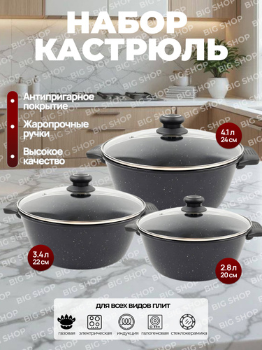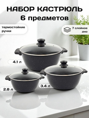 Набор кастрюль из кованого алюминия с мраморным антипригарным покрытием 6 предметов, 4.1 л 3.4 л 2.8 л, посуда для всех типов плит, с крышками, термостойкие ручки