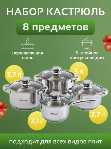Набор кастрюль из нержавеющей стали с крышкой 2.7 л, 3.7 л, 5 л и сотейник 2.1 л KELLI, 8 предметов, подходит для всех видов плит, включая индукционных, многослойное капсульное дно
