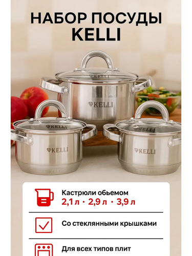 Набор посуды KELLI KL-4246 из стали. кастрюли 2.1/2,9/3,9л, 7-ми слойное индукционное дно, стеклянные крышки