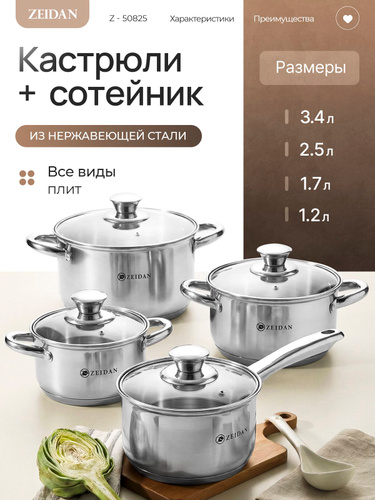 Набор кастрюль с крышкой из нержавеющей стали ZEIDAN Z-50825, 8 предметов, для всех типов плит