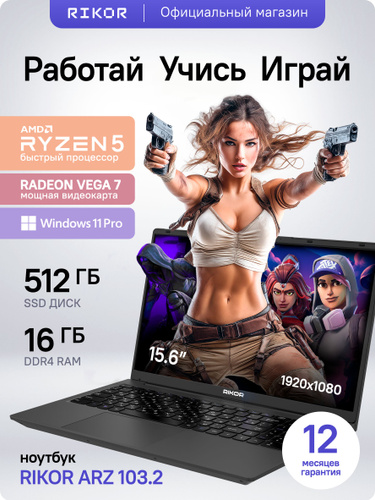 Rikor ARZ 103.1/15 EBF876F5 Ноутбук 15.6", AMD Ryzen 5 5560U, RAM 16 ГБ, SSD, AMD Radeon Vega 6, Windows Pro, (EBF876F5), черный, Русская раскладка