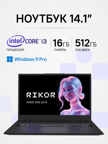 Rikor NINO 203.2 D3E230B1 Ноутбук 14.1", Intel Core i3-1220P, RAM 16 ГБ, SSD 512 ГБ, Intel UHD Graphics, Windows Pro, (10010798), черный, Русская раскладка