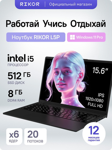 Rikor для работы и учебы Ноутбук 15.6", Intel Core i5-1235U, RAM 8 ГБ, SSD 512 ГБ, Windows Pro, (7393A620), черный, черный матовый, Русская раскладка