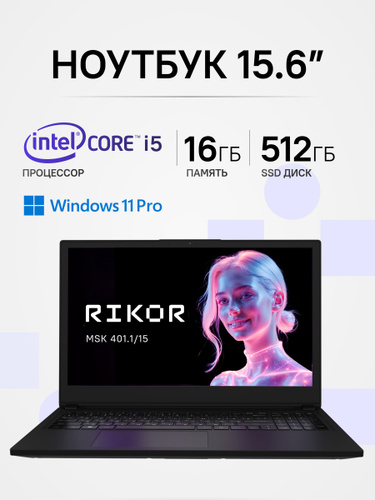 Rikor MSK 401.1 Ноутбук 15.6", Intel Core i5-12450H, RAM 16 ГБ, SSD 512 ГБ, Intel UHD Graphics, Windows Pro, (C1F918CB), черный матовый, Русская раскладка