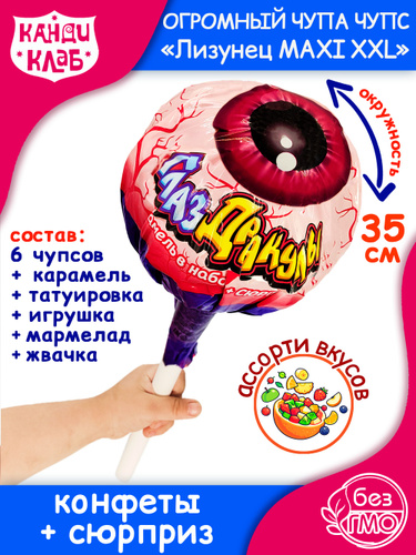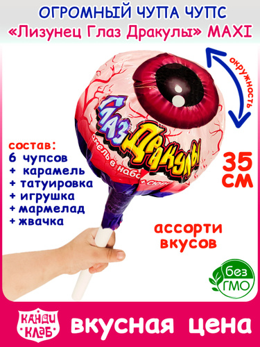 Набор ОГРОМНЫЙ Чупа Чупс Лизунец MAXI Макси ГЛАЗ ДРАКУЛЫ XXL большой (1шт - 112гр) конфеты, карамель, жевательная резинка, мармелад Канди Клаб. Леденцы, жвачка с тату, игрушка в подарок на Новый годом