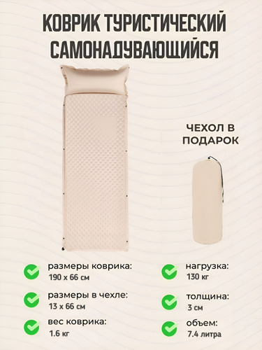Коврик-матрас туристический самонадувающийся в палатку 190х66х3 см/ с чехол, кремовый