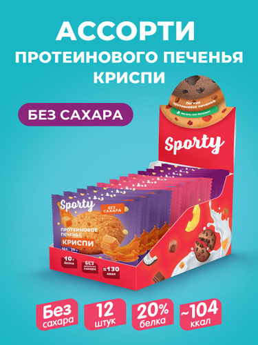 Протеиновое печенье без сахара Sporty КРИСПИ ассорти, низкокалорийное, спортивное питание, 12 штх30г