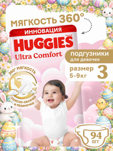 Подгузники Huggies Ultra Comfort для девочек 3 M размер, 5-9 кг, 94 шт