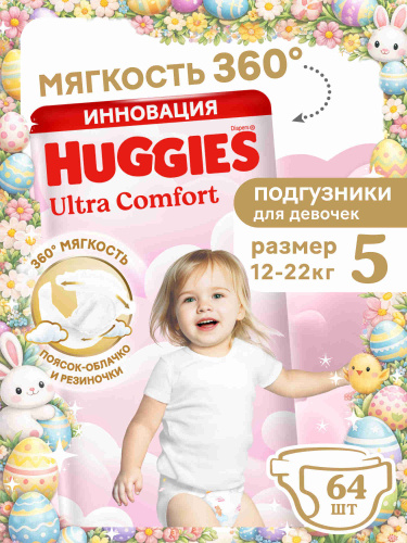 Подгузники Huggies Ultra Comfort для девочек 12-22кг, 5 размер, 64шт