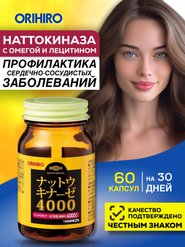ORIHIRO БАД Наттокиназа 4000 FU, Омега-3 (DHA, EPA, DPA) для сердца, вен и сосудов (60 капсул)