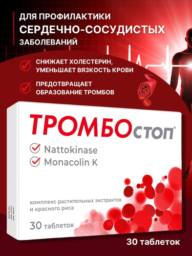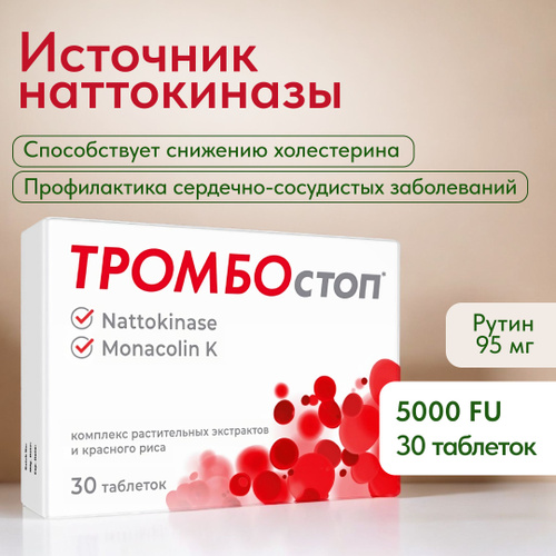 Наттокиназа, Монаколин/ Тромбостоп - витамины для сердца и сосудов 5000 FU, 30 таблеток/ Комплекс растительных экстрактов и красного риса