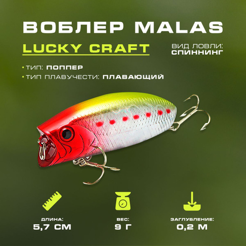Поппер на щуку, воблер шумовой поверхностный Malas 57 мм, Вес 9 гр., цвет 19 Red Head Sunshine Laser