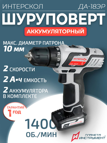 Аккумуляторный шуруповерт ИНТЕРСКОЛ ДА-18ЭР 2 АБ по 2А/ч, экобокс