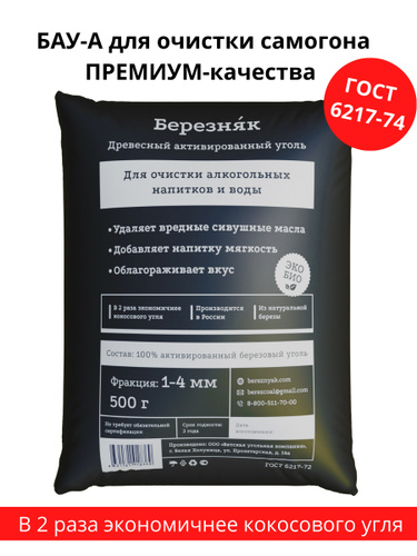 Уголь березовый активированный для очистки самогона БЕРЕЗНЯК 500 грамм