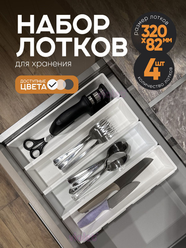 Лоток для столовых приборов в ящик 320х82мм, набор 4 шт., цвет белый / кухонный органайзер сборный для канцелярии