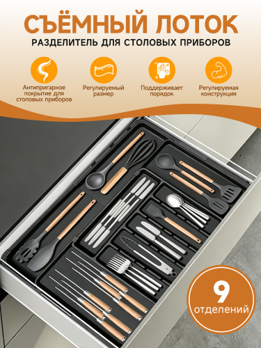 Лоток для столовых приборов 8 секций раздвижной в ящик, подставка для ложек и вилок на кухню
