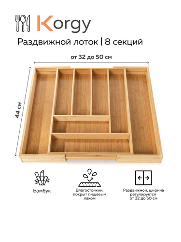 Лоток для столовых приборов раздвижной, деревянный, в ящик 500 на 400 мм, органайзер 8 секций