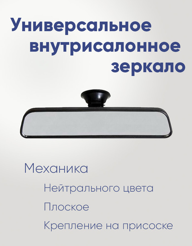 Зеркало заднего вида салонное Механика на присоске, нейтральный плоский зеркальный элемент, поворотная конструкция, размер 285 x 70 мм.