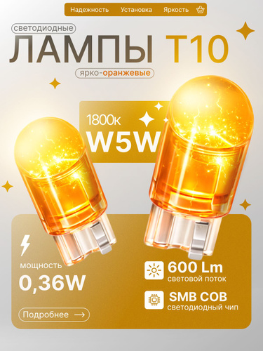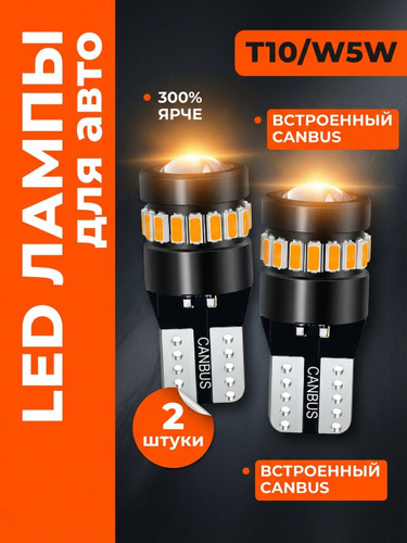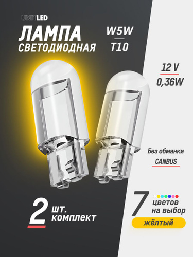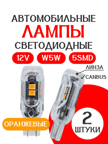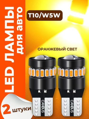 Лампа автомобильная W5W, T10 светодиодная, оранжевый (желтый) свет, 2 шт в габариты, дхо, подсветку салона/багажника/номеров/дверей/салона