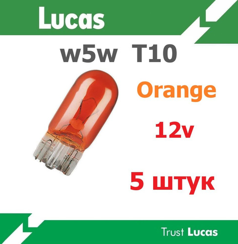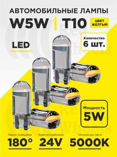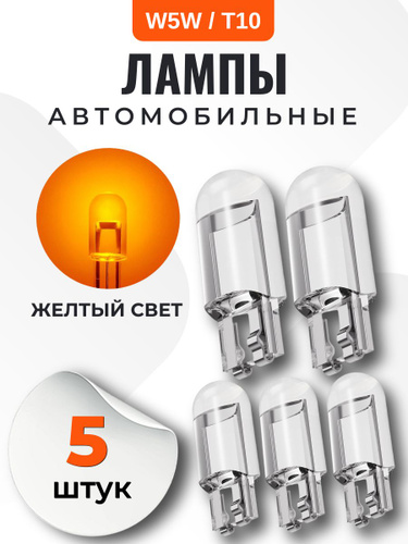 Лампа автомобильная W5W, T10 светодиодная, оранжевый (желтый) свет, 5 шт в габариты, дхо, подсветку салона/багажника/номеров/дверей/салона