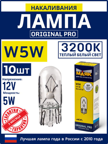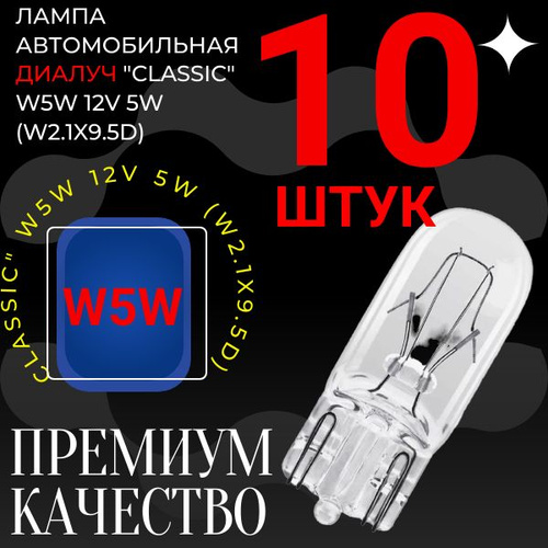 Лампа автомобильная W5W T10 W2.1x9.5D, 12V 5W, безцокольная, габаритная, 10 шт