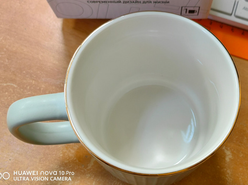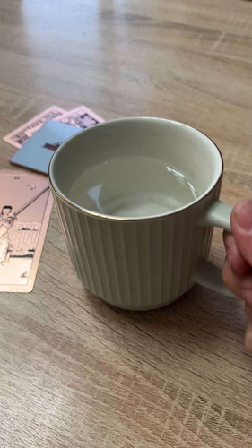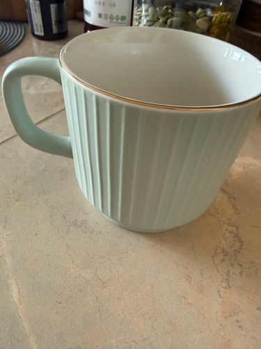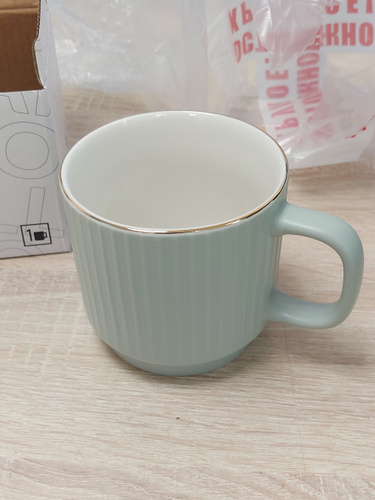 Цвет кружки имеет глубокий мятный оттенок, который придаёт ей особую изысканность и индивидуальность. Завершает эту элегантную палитру золотой ободок, добавляя кружке дополнительный шик и роскошь, подчёркивая её изысканный характер.