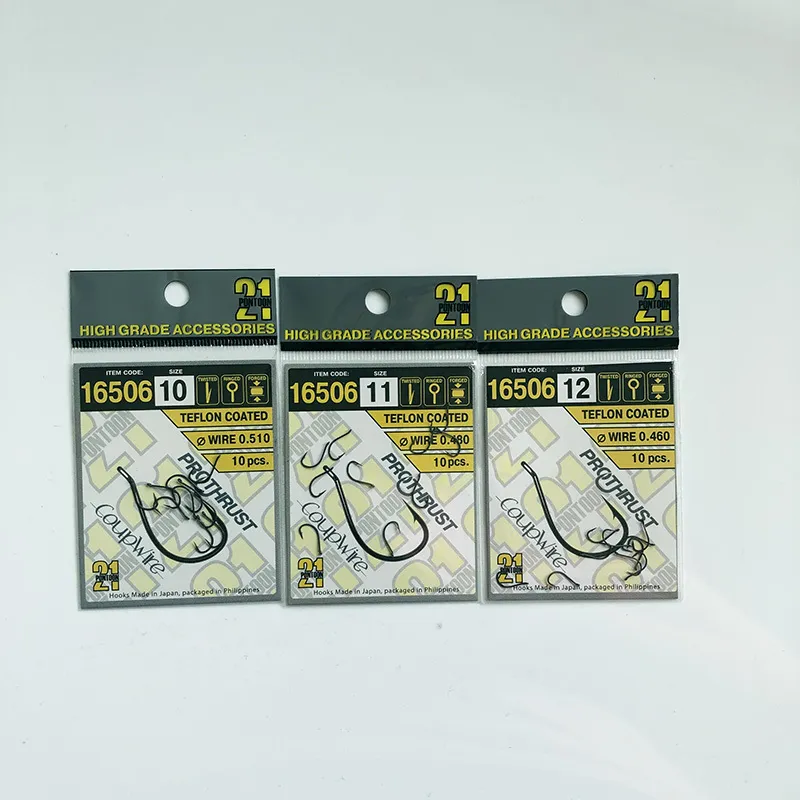 Кованные (forged) крючки Pontoon21 серии 16506 изготовлены из стальной проволоки высшего качества (CoupWire) и прошли процесс высокоточной закалки, благодаря которому отлично держат острейшую заточку (ProThrust). Эти крючки долго не тупятся, что позволяет использовать даже самые нежные насадки. Они обладают необходимой упругостью, чтобы при сохранении прочности, не разгибаться и не ломаться на больших нагрузках.