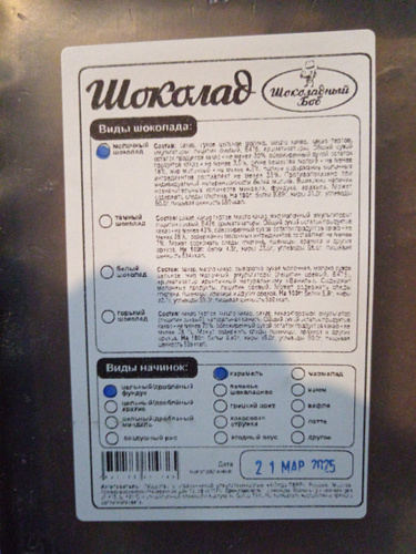Сахар, какао-масло, ваниль, молоко сухое обезжиренное, молочный жир, какао тертое, соевый лецитин, лактоза пищевая.