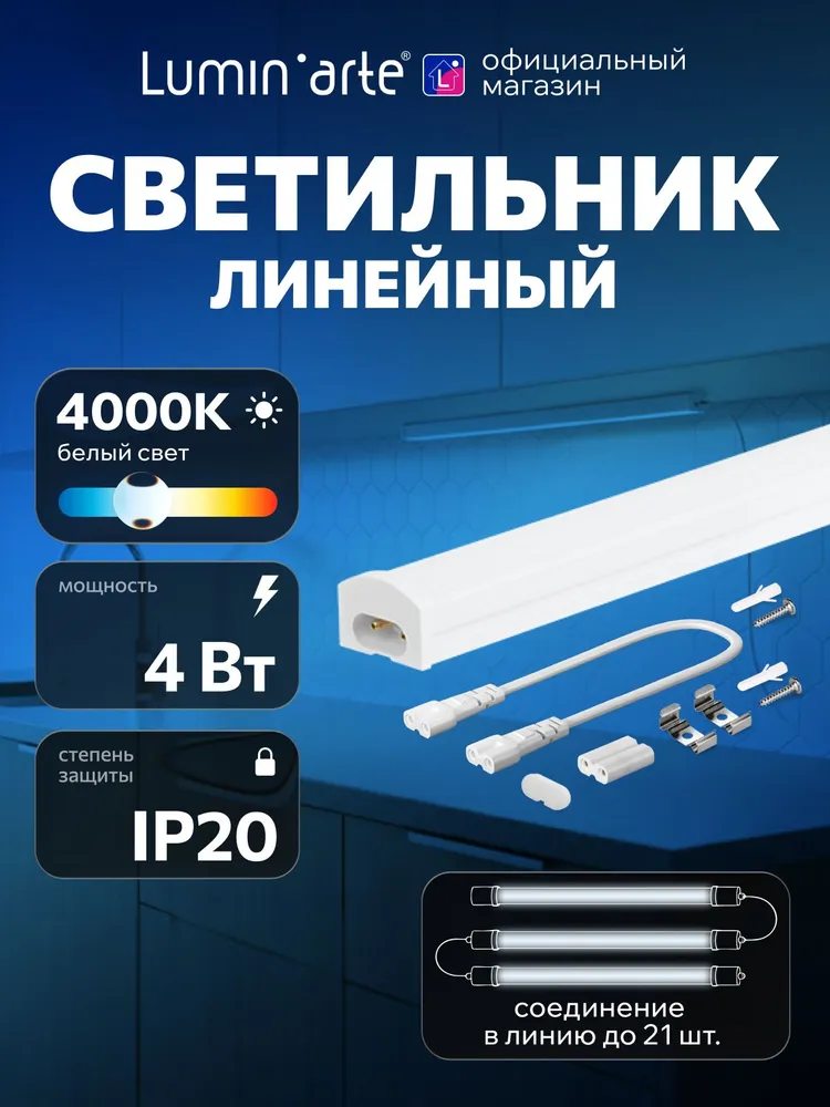 В базовый комплект входят: Светильник -1 шт., Торцевые заглушки, Крепежный комплект, Гибкий соединитель (A) - для нестандартных конфигураций, Жесткий соединитель (Б) - для прямолинейных конструкций.