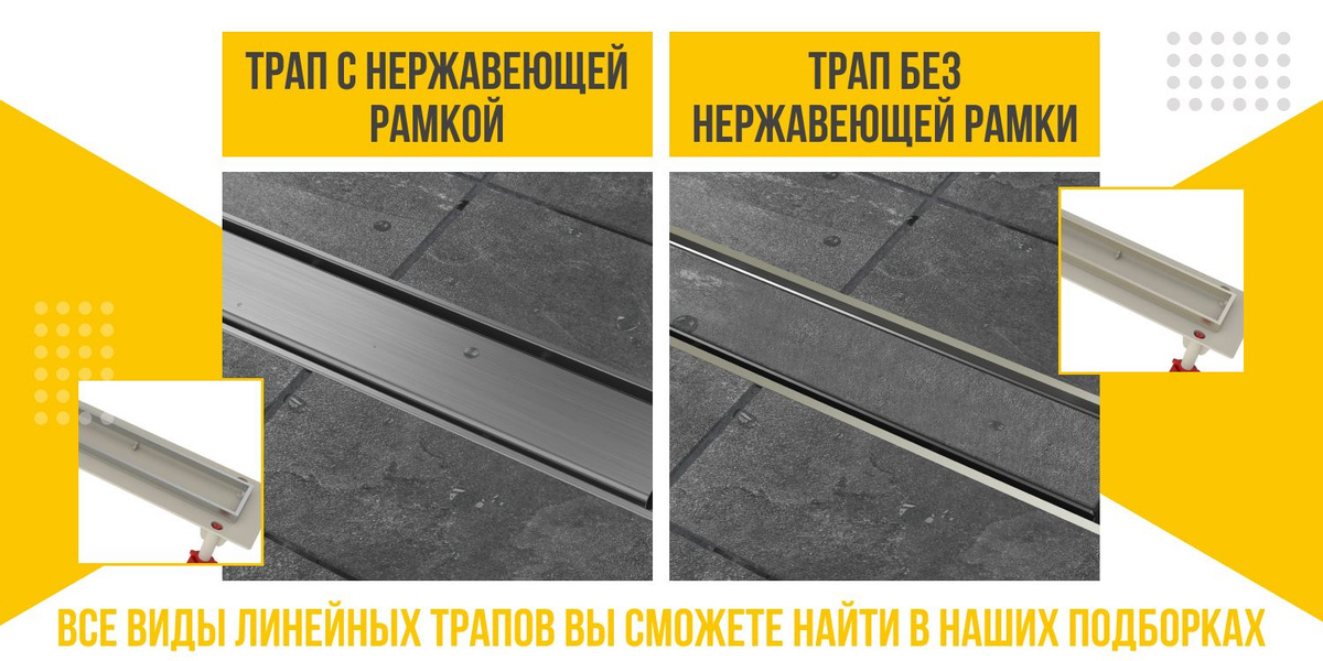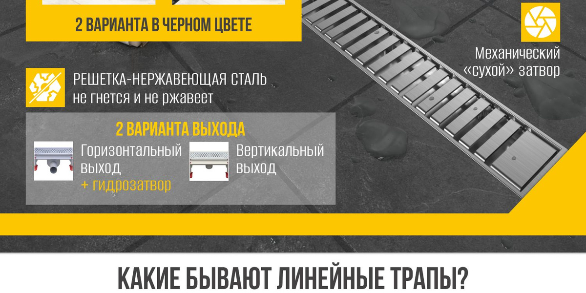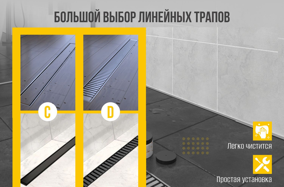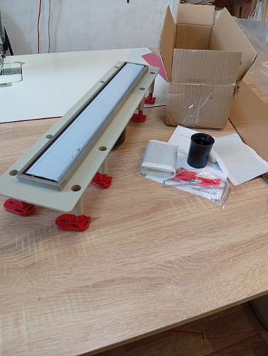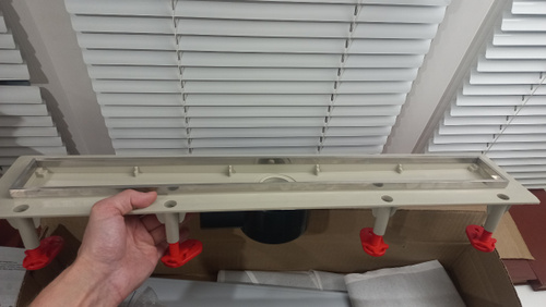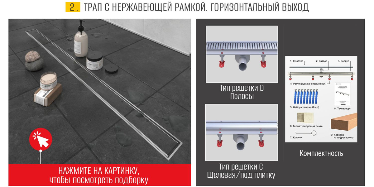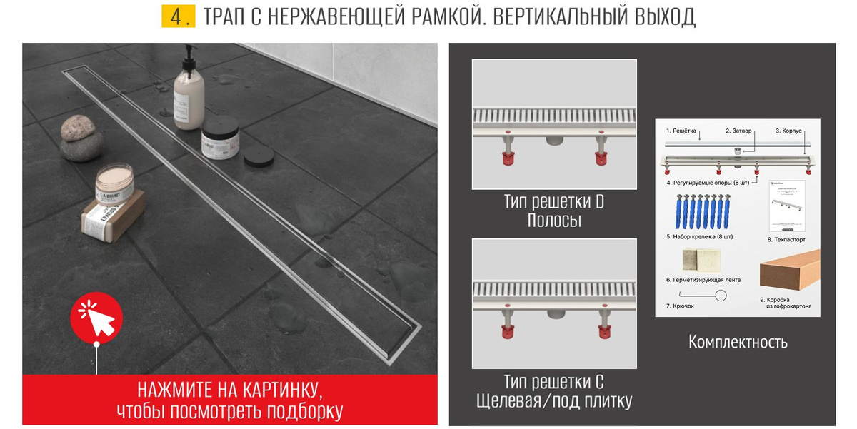 Решетка из нержавеющей стали; Корпус трапа из ABS-пластика с рамкой из нержавеющей стали; Опоры регулируемые (8 шт.); Сифон; Механический «сухой» затвор; колпачок гидрозатвора; набор крепежа, герметизирующая лента и крючок для извлечения декоративной решетки из корпуса трапа.