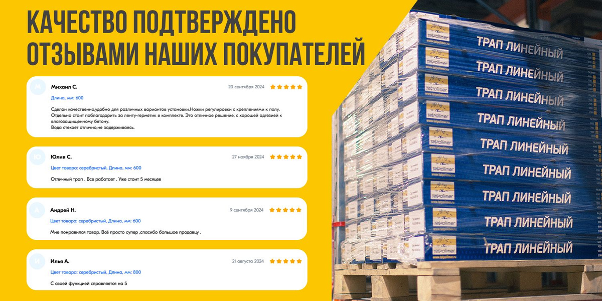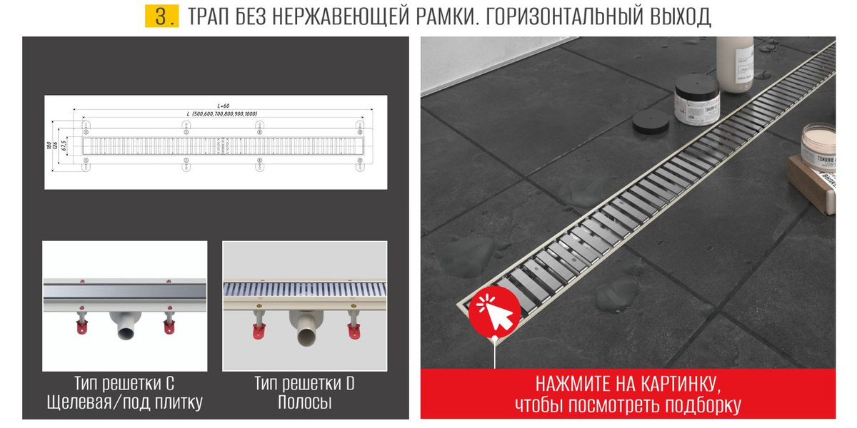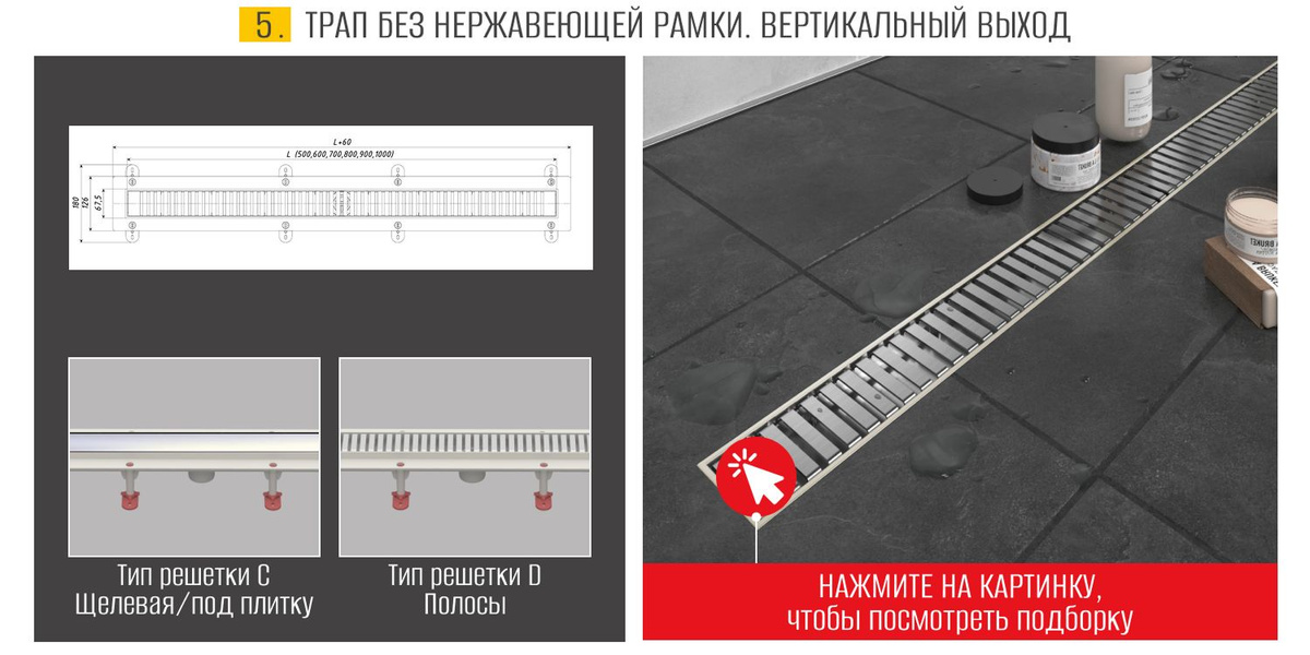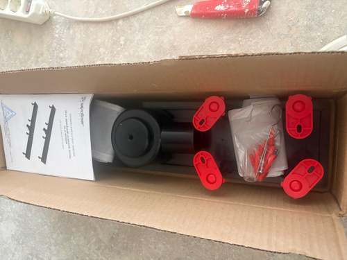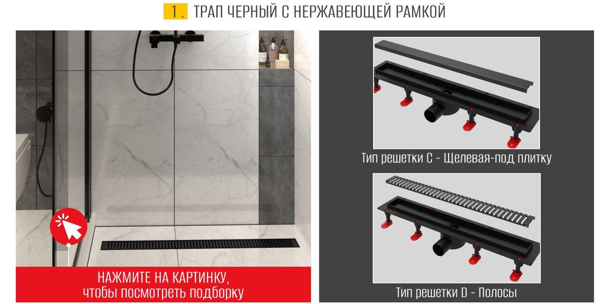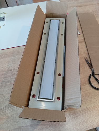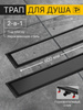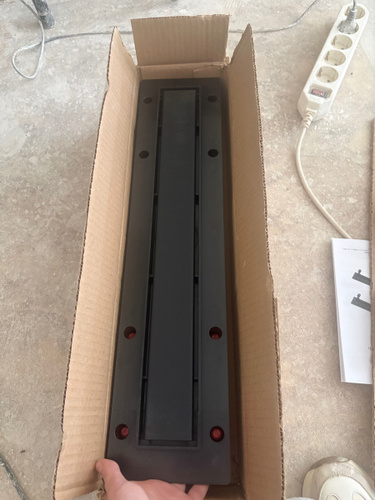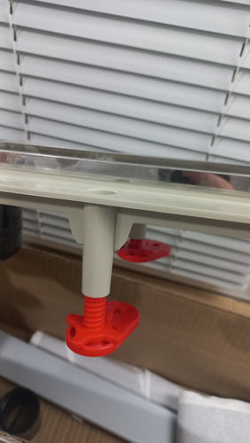Решетка из нержавеющей стали; Корпус трапа из ABS-пластика с рамкой из нержавеющей стали; Опоры регулируемые (8 шт.); Сифон; Механический «сухой» затвор; колпачок гидрозатвора; набор крепежа, герметизирующая лента и крючок для извлечения декоративной решетки из корпуса трапа.